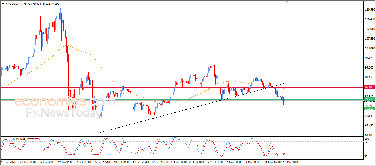 O preço da prata caiu em sua última negociação intradiária, rompendo o suporte de US$ 79,50, apesar do surgimento de sinais positivos dos indicadores de força relativa após atingir níveis de sobrevenda. Isso indica claramente o domínio das forças vendedoras sobre o movimento do preço, com a continuidade da pressão dinâmica negativa, representada pela negociação abaixo da EMA50, intensificando a pressão negativa em torno do metal e reforçando o cenário de aprofundamento das perdas em um futuro próximo.