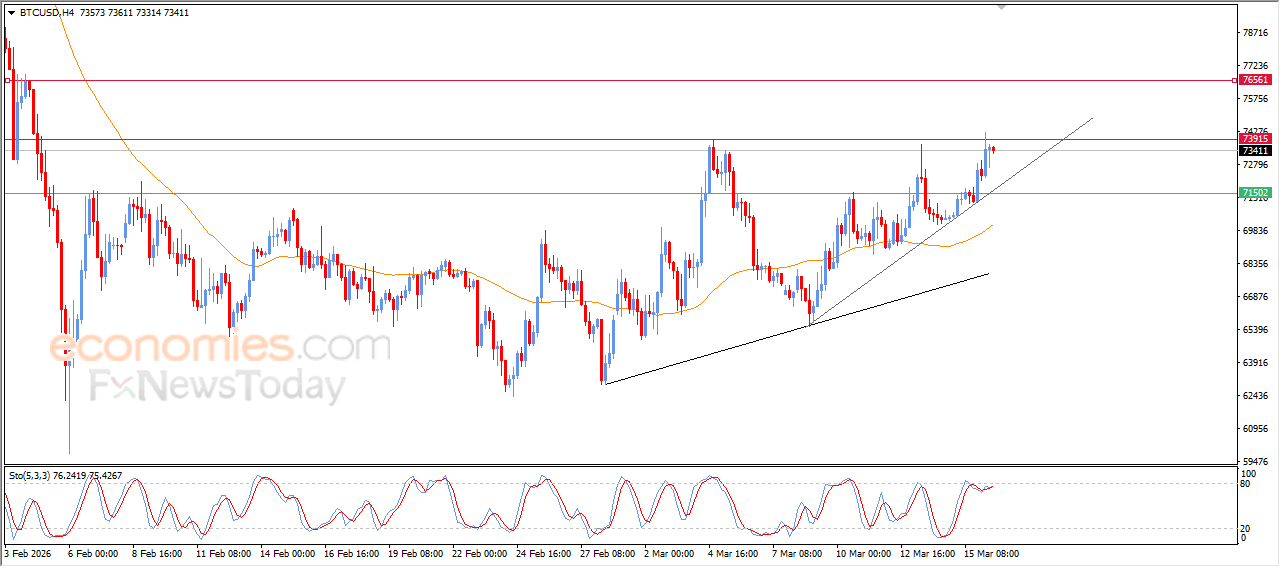 O preço do BTCUSD manteve seus ganhos no último pregão, apresentando flutuações que buscam ganhar impulso de alta para romper a importante resistência de US$ 74,00, em meio ao suporte contínuo devido à sua negociação acima da EMA50, sob a dominância da tendência corretiva de alta no curto prazo, com sua negociação paralela às linhas de tendência principal e secundária, observando-se o surgimento de sinais positivos dos indicadores de força relativa.