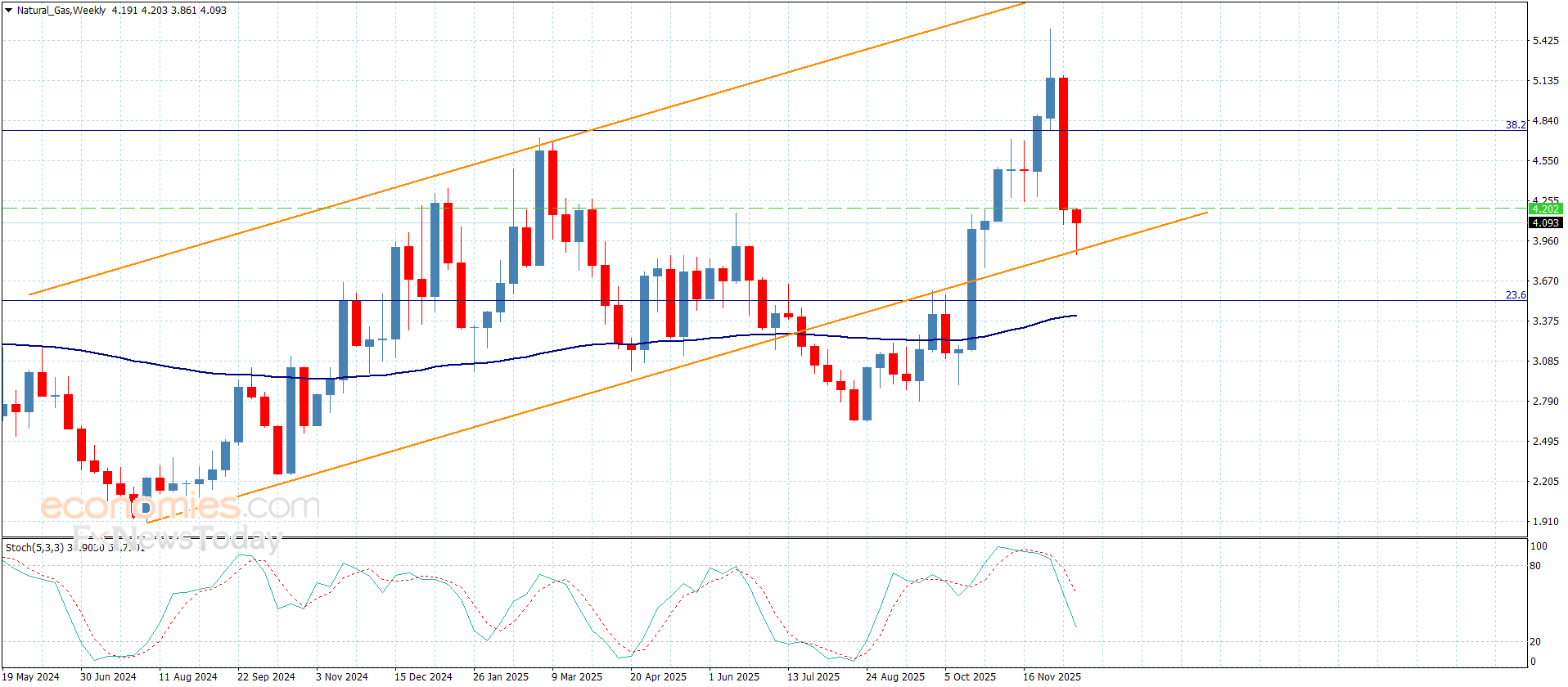 O preço do gás natural tentou resistir às pressões negativas, encerrando a negociação em baixa após testar o suporte do canal de alta em US$ 3,880, formando uma recuperação positiva ao se estabilizar próximo a US$ 4,080.