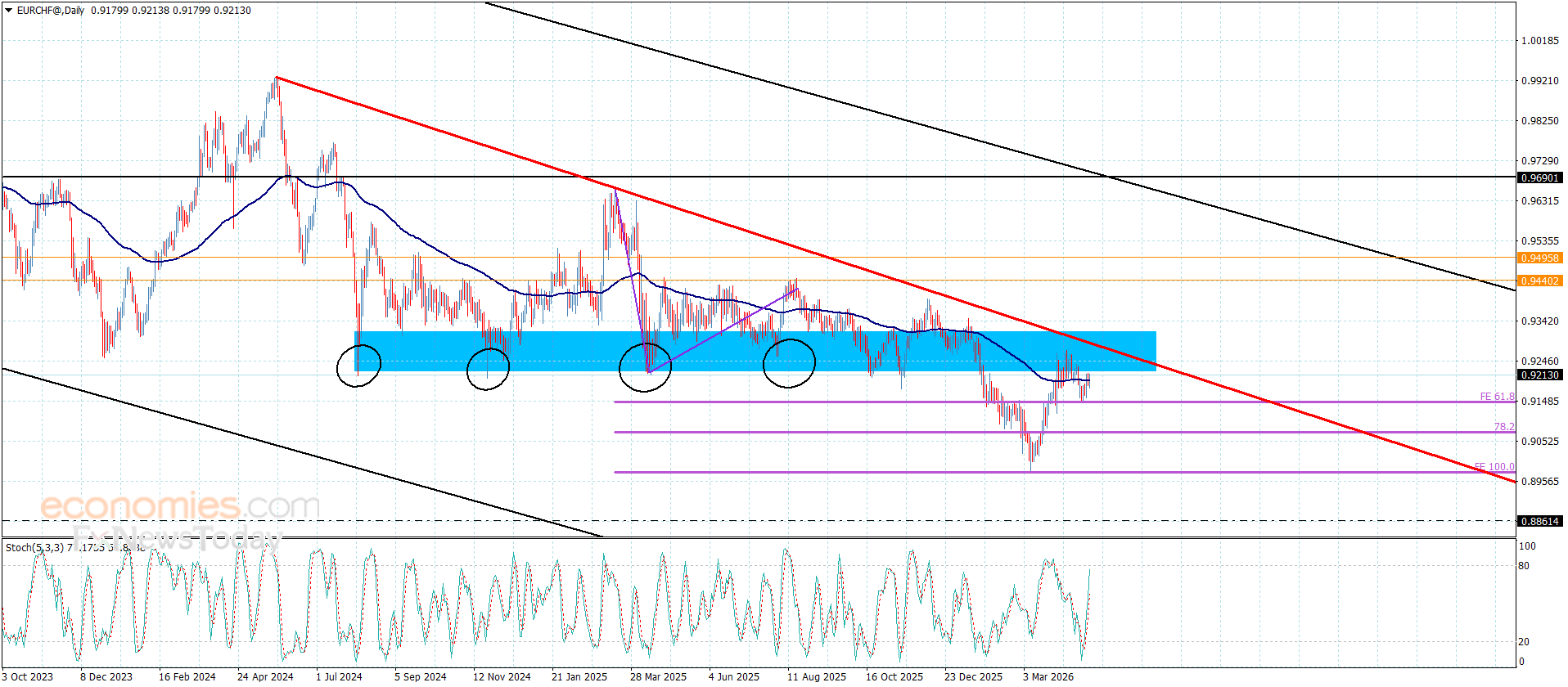O par EUR/CHF começou a ganhar impulso positivo nas últimas negociações, uma vez que o estocástico ultrapassou o nível de 50 para se manter estável acima do nível de extensão de Fibonacci de 61,8%, em 0,9145, registrando alguns ganhos ao atingir 0,9215.