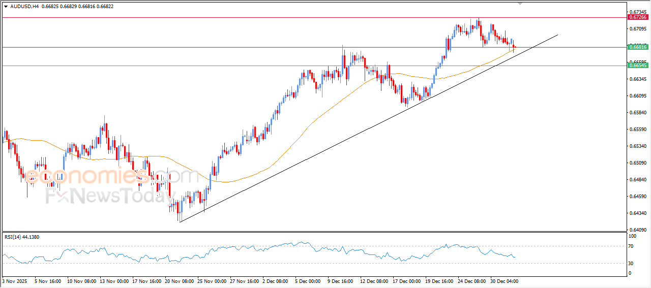 O preço do par AUD/USD caiu em suas últimas negociações intradiárias, em meio a tentativas de encontrar uma mínima ascendente para usá-la como base e ganhar impulso de alta para sua recuperação, apoiado no suporte da EMA50, acompanhado por um teste do suporte chave de 0,6680, em meio à dominância da tendência principal de alta no curto prazo, com o preço sendo negociado ao longo da linha de tendência de suporte para essa tendência. O indicador de força relativa (RSI) atingiu níveis de sobrevenda exagerados em comparação com o movimento do preço, indicando um enfraquecimento da pressão negativa sobre o preço.