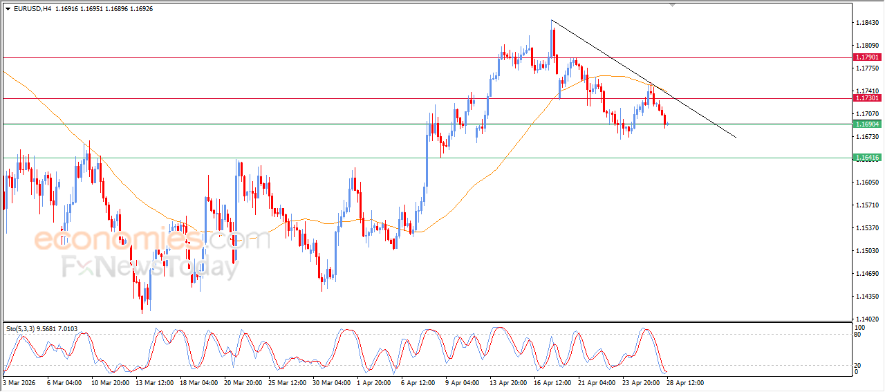 O par EURUSD continuou a cair durante o pregão recente, atingindo o nível de suporte de 1,1690, alvo previsto em nossa análise anterior, em meio à predominância de uma onda corretiva de baixa no curto prazo. O par negocia ao longo da linha de tendência de suporte para essa trajetória, além da continuidade da pressão negativa devido à sua negociação abaixo da EMA50, intensifica a pressão sobre o preço, especialmente com o surgimento de sinais negativos dos indicadores de força relativa, apesar de ter atingido níveis de sobrevenda.