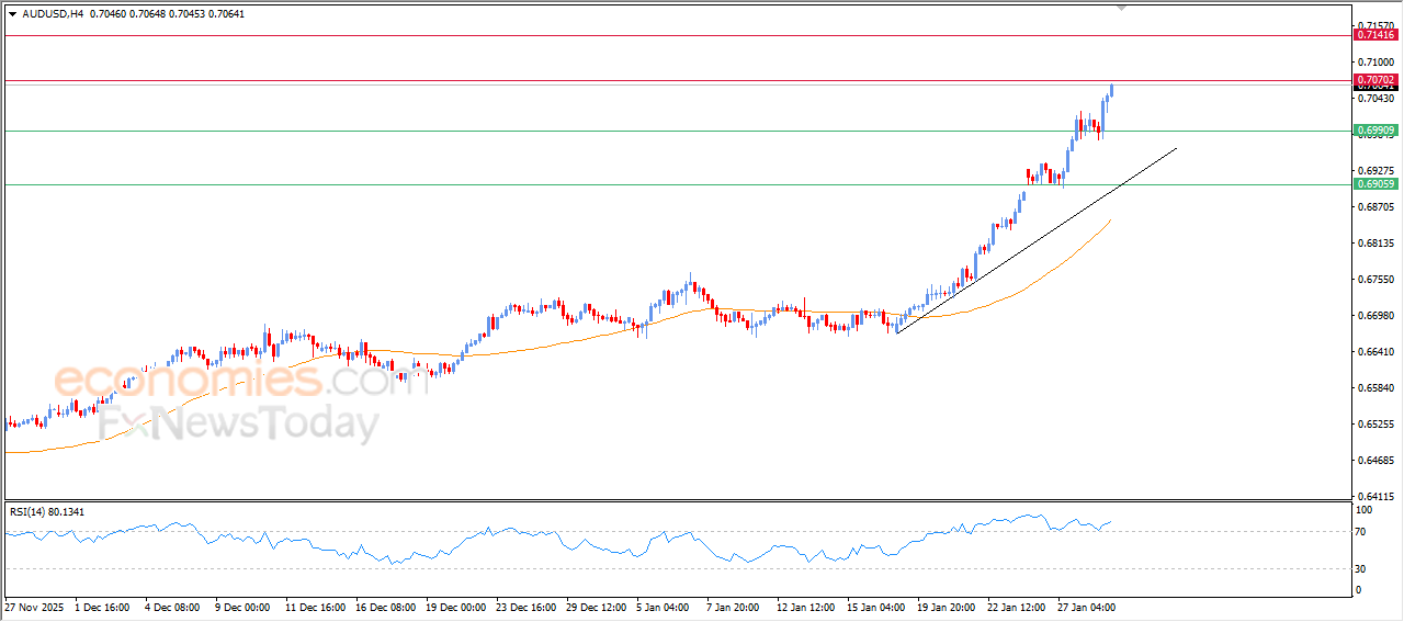 O preço do par AUD/USD subiu acentuadamente em suas últimas negociações intradiárias, aproximando-se da resistência atual em 0,7070, que representa uma meta esperada em nossa análise anterior, em meio ao domínio da principal tendência de alta no curto prazo, com sua negociação ao longo da linha de tendência secundária de suporte para essa trajetória, além da continuação da pressão dinâmica representada por sua negociação acima da EMA50, acompanhada pelo surgimento de sinais positivos dos indicadores de força relativa.