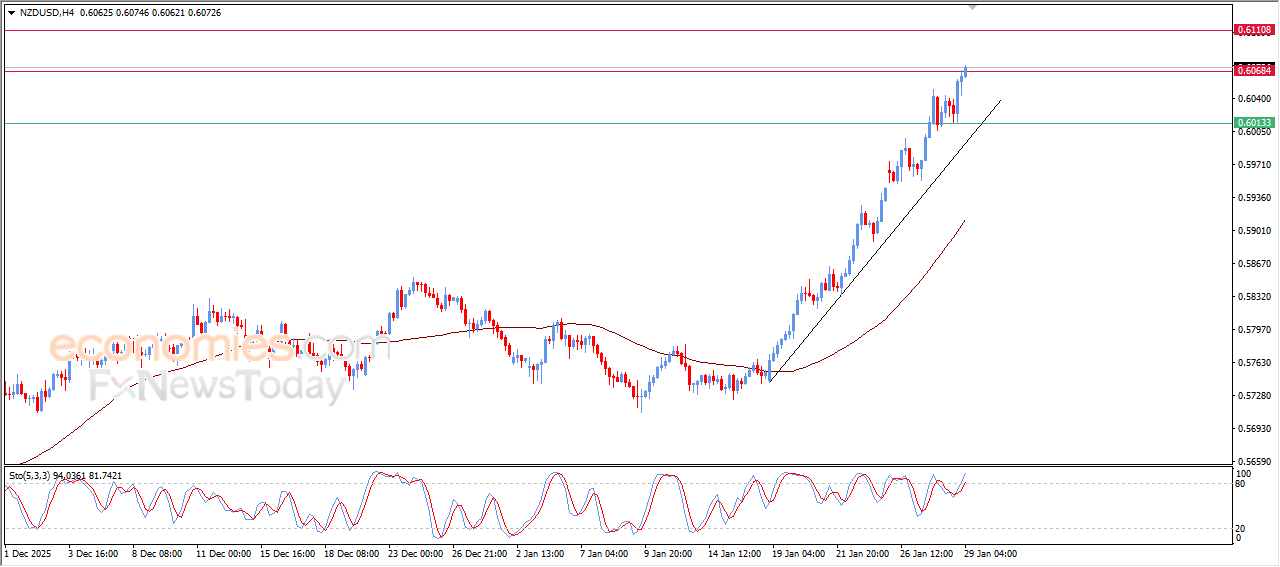 O preço do NZD/USD estendeu seus ganhos no último pregão, atingindo a resistência de 0,6070, que representa uma meta esperada em nossa análise anterior. O par aproveitou a negociação ao longo de uma forte linha de tendência de alta de curto prazo, que indica a força do momentum circundante, com a continuação do suporte dinâmico representado pela negociação acima da EMA50, além do surgimento de sinais positivos dos indicadores de força relativa.