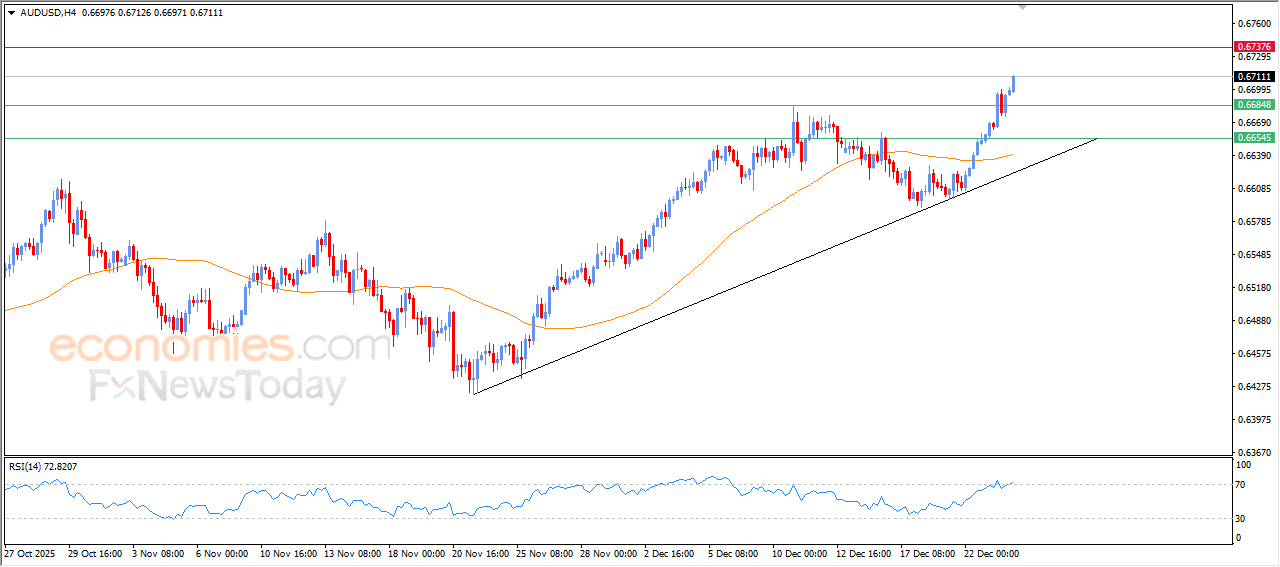 O preço do par AUD/USD continuou subindo em suas últimas negociações intradiárias, impactado pela quebra da resistência chave em 0,6685, em meio à dominância da principal tendência de alta no curto prazo, com sua negociação alinhada à linha de tendência de suporte para essa trajetória, além do surgimento de sinais positivos nos indicadores de força relativa, apesar de ter atingido níveis de sobrecompra, indicando a predominância do poder de compra sobre o preço.