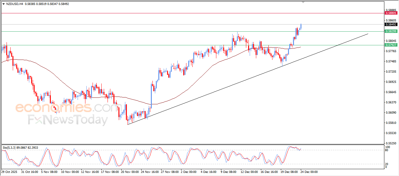 O preço do NZD/USD subiu continuamente em suas últimas negociações intradiárias, confirmando a superação da resistência chave em 0,5830, em meio à continuidade do suporte dinâmico representado por sua negociação acima da EMA50 e sob o domínio da principal tendência de alta no curto prazo, especialmente por sua negociação ao longo da linha de tendência, com o surgimento de sinais positivos nos indicadores de força relativa, após se livrar das condições de sobrecompra, abrindo caminho para a obtenção de mais ganhos no curto prazo.
