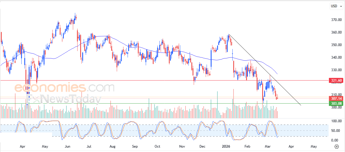 Portanto, esperamos que o preço das ações caia durante as próximas sessões de negociação, visando o importante nível de suporte próximo, em US$ 303,00.