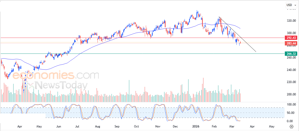 Portanto, esperamos que o preço das ações caia durante as próximas sessões de negociação, desde que permaneça estável abaixo do nível de resistência de US$ 292,45, visando o nível de suporte de US$ 266,35.