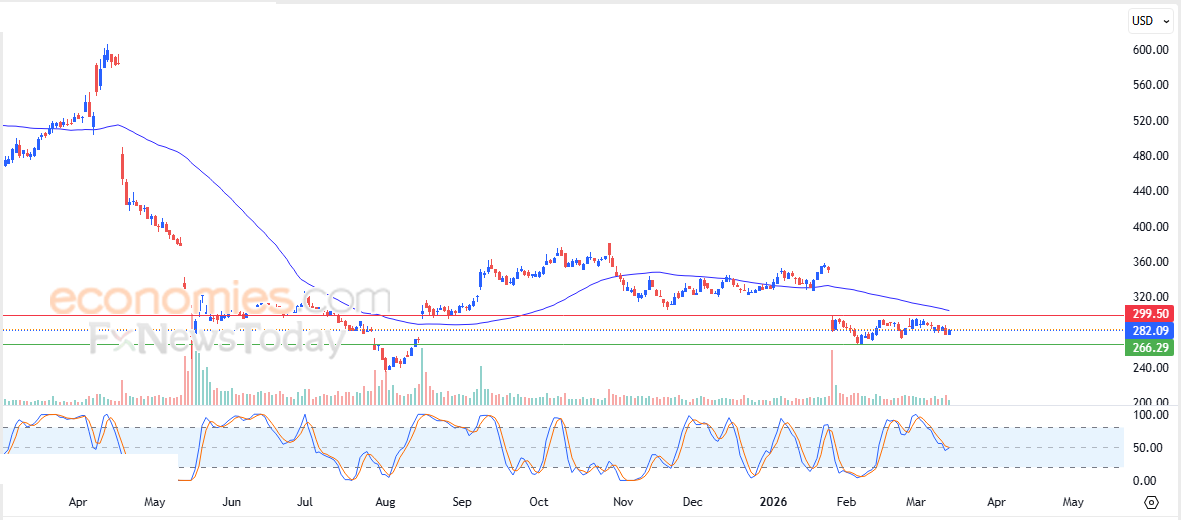 Portanto, esperamos que o preço das ações caia durante as próximas sessões de negociação, desde que a resistência em US$ 299,50 permaneça intacta, visando o nível de suporte em US$ 266,30.